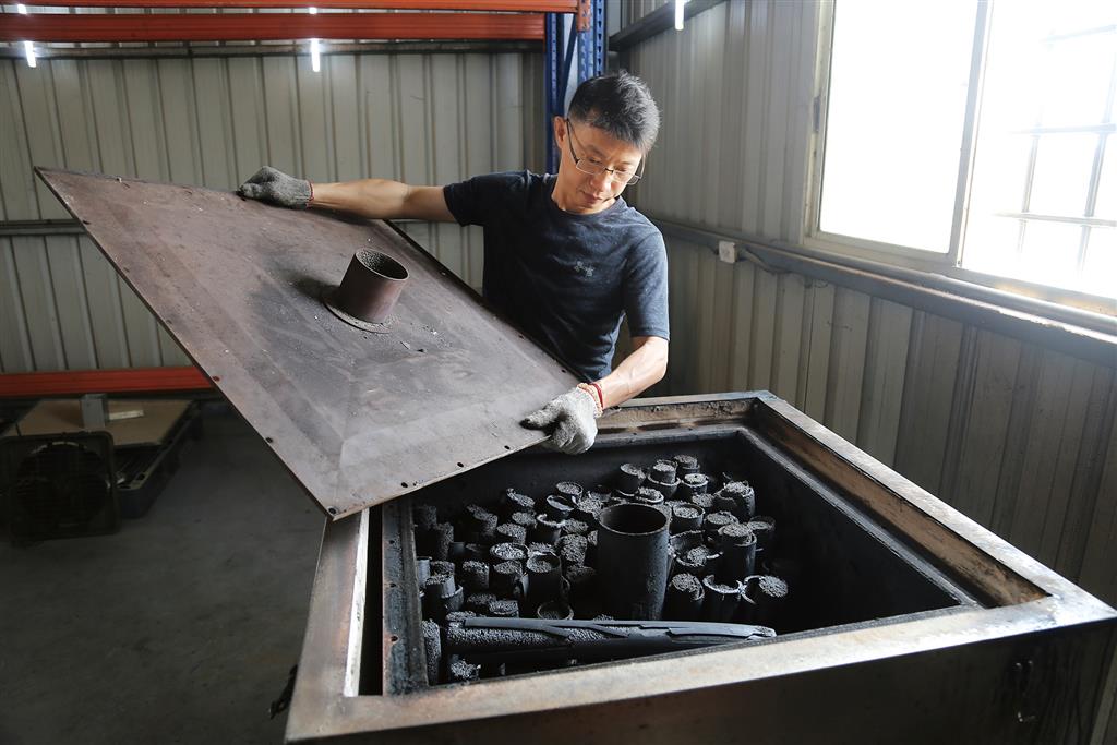 「厭氧燃燒」技法是以特製的無煙窯爐,以間接加熱方式燒製竹鹽,能高溫、均溫、均壓、完整密閉。值得特別一提的是,原本是直接燒竹尾料,後來成功研發將竹尾料打碎成粉末,再透過超高壓造粒技術,做成生質顆粒燃料;接著又研發出可以自動控制定時投料的模式,讓自動化燒製流程更為精進。他說:「傳統技術不是不好,但是新的技術,可以做得更好、更穩定、更環保。」