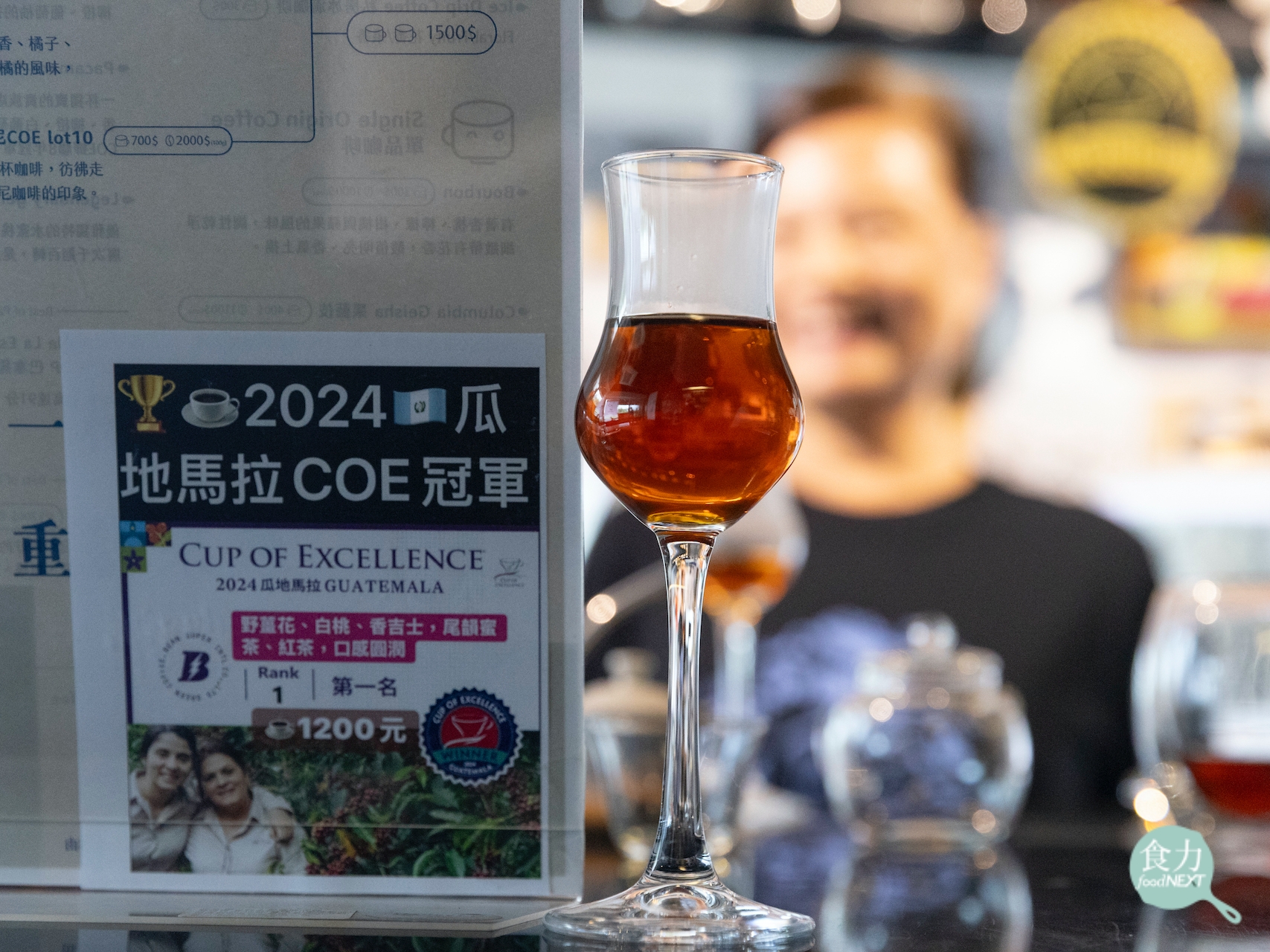 「這是台灣最好的一杯咖啡,花香、焦糖、甜感、桃子、糖蜜、柑橘的風味,每一口都驚艷。」菜單上這樣形容曾福森得奬咖啡。劉玉嬌(Joy)是一位咖啡杯測師、烘豆師,更是COE競標咖啡國際評審。店裡提供2024瓜地馬拉競標COE冠軍,一杯單價1,200元,風味「野薑花、白桃、香吉士,尾韻蜜茶、紅茶,口感圓潤。」今年又再度競標到2025瓜地馬拉COE冠軍豆。