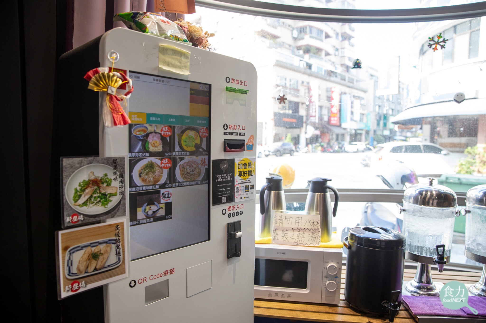 麵屋竈引入自動化點餐與送餐設備,並設置自助區,顧客可自行加湯和加熱沾麵湯汁,減少外場服務人力。(童伯祥攝)