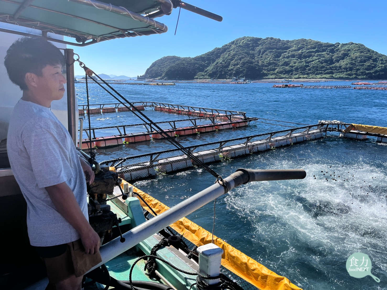 漁民藤川雅洋在投餵飼料時,會仔細觀察魚群湧動狀況,判斷魚隻的食慾、活動力與健康狀態。(余麗姿攝)