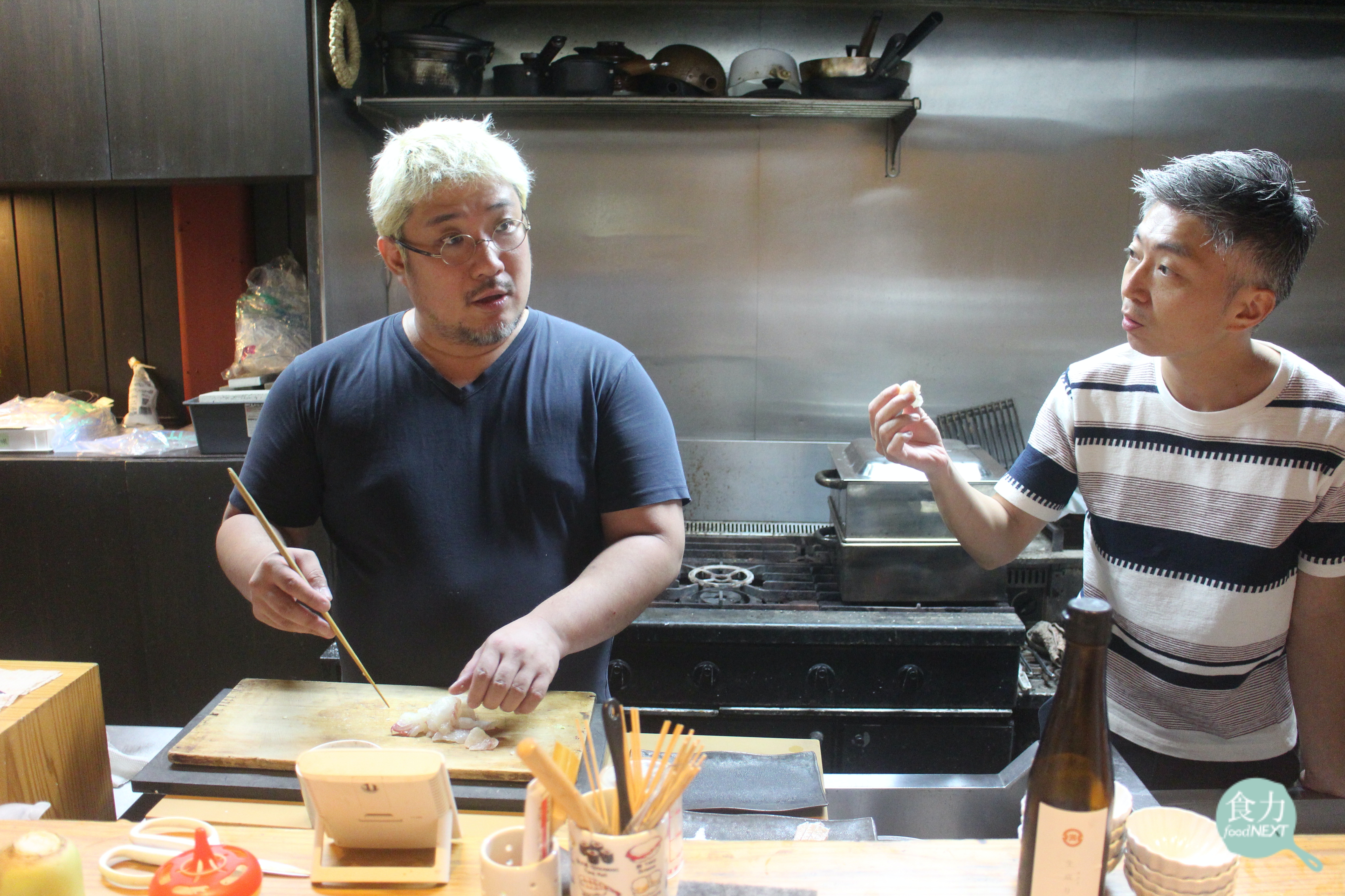 日本しの田主廚篠田悠介(圖左)與台灣MUME創辦人林泉(圖右)兩人在日本交流水產料理。(余麗姿攝)