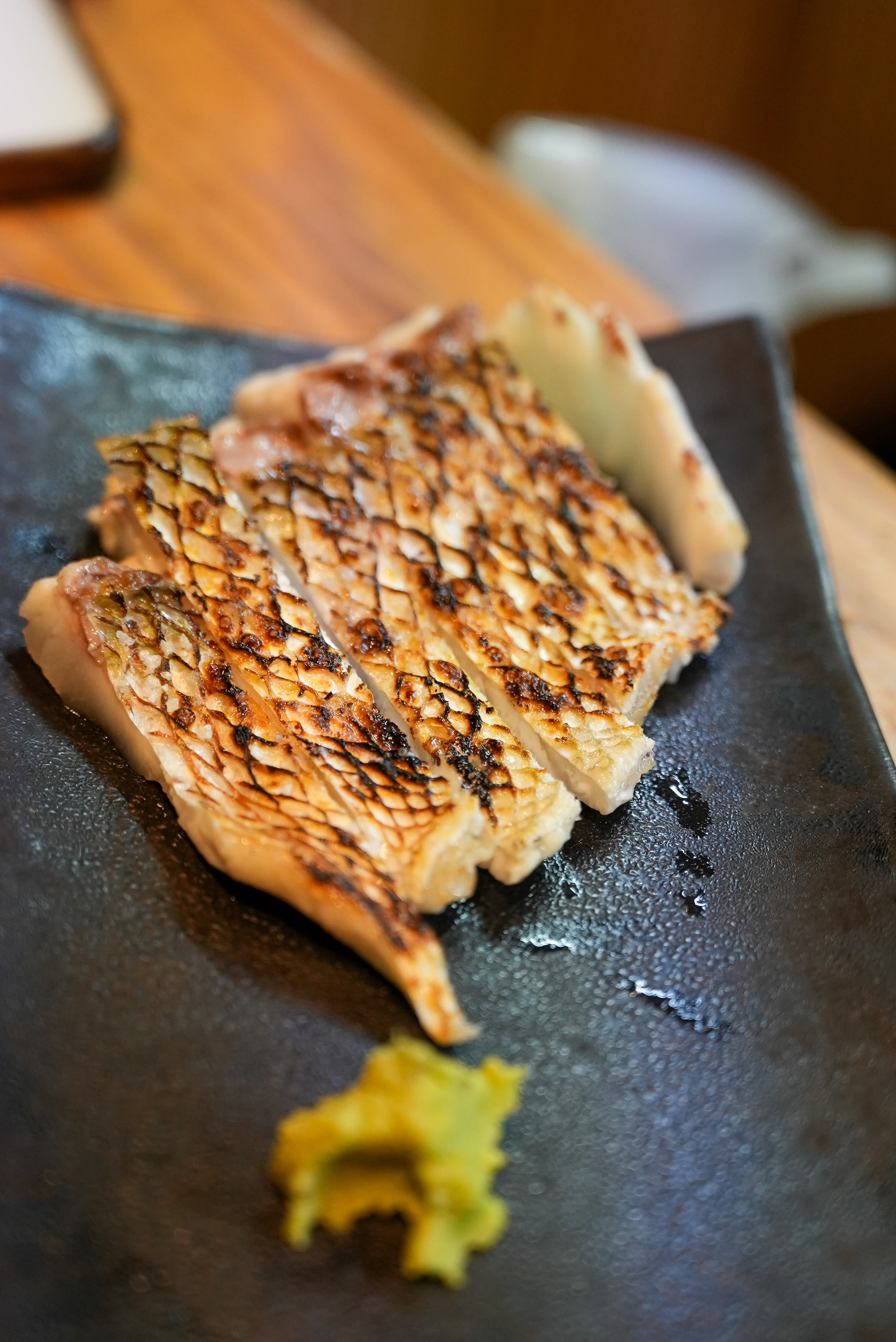 「這個鯛魚就只有單純蒸過而己,用高湯加上鹽和昆布去蒸。」篠田說,店裡無菜單料理中,清蒸鯛魚是熟客必點,保留魚肉細膩溫和的鮮甜。篠田說,鰤魚脂肪較多,適合做烤魚,將魚皮烤至酥脆,魚肉輕涮熱湯保持半生狀態,脂肪鮮味爆發。鰤魚也可裹蛋液麵衣油炸,保留鮮嫩口感。利用昆布熬煮的高湯蒸鰤魚,加蘿蔔泥與七味粉調味,增添層次。篠田透過火候與時間的掌握,展現食材最自然最鮮美的風味。