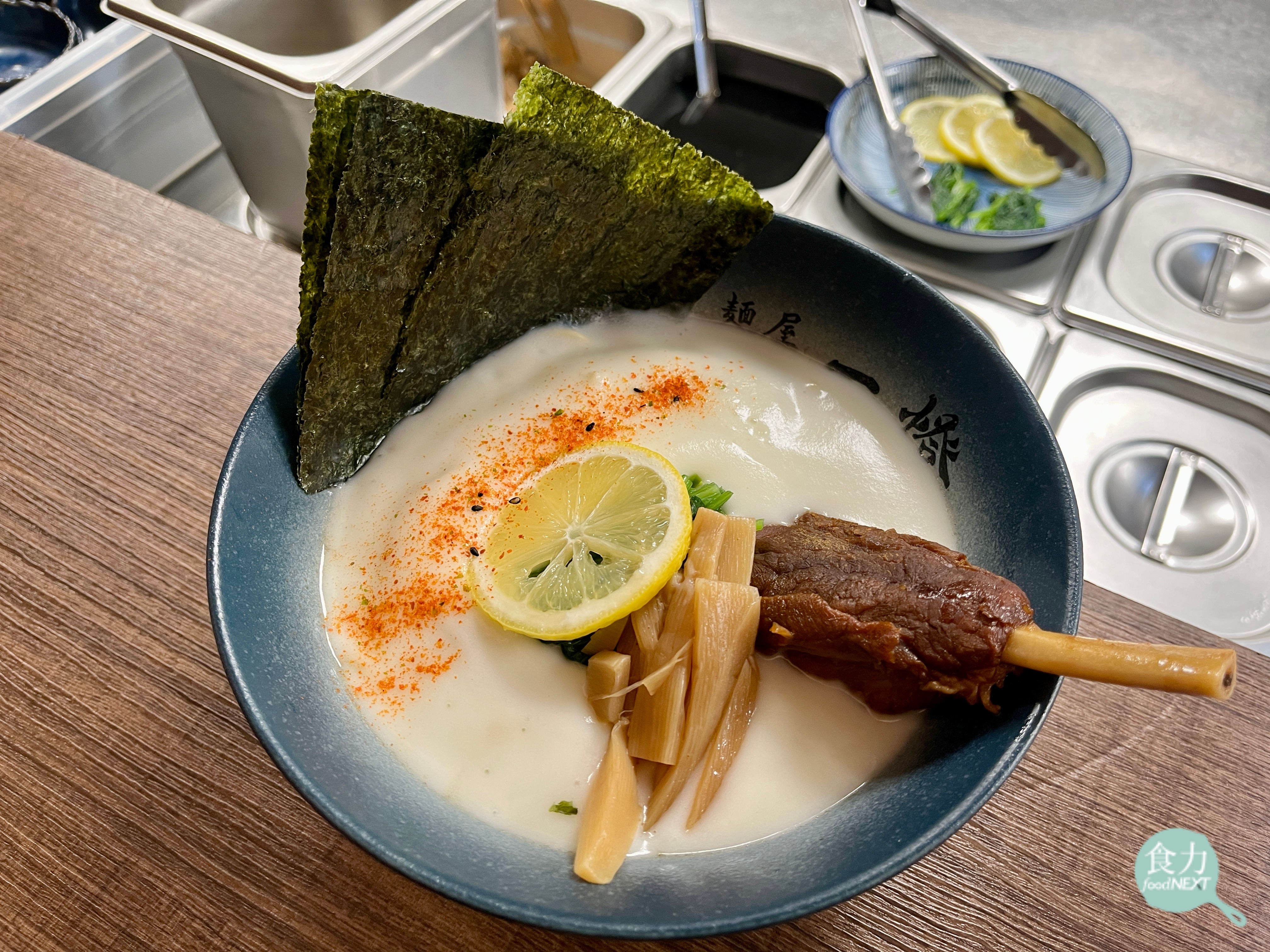 以這次泡系拉麵為例,長時間熬煮的雞豚湯底本身風味濃厚,如果直接強調,很容易壓過整體層次。因此團隊選擇引入法式洋芋泥的概念,將其打成泡泡,作為風味之間的緩衝層。「洋芋泥本身味道很淡,再加上雞豚湯,以及加上檸檬片點綴,整體就會回到比較平衡的狀態。」陳之穎表示。