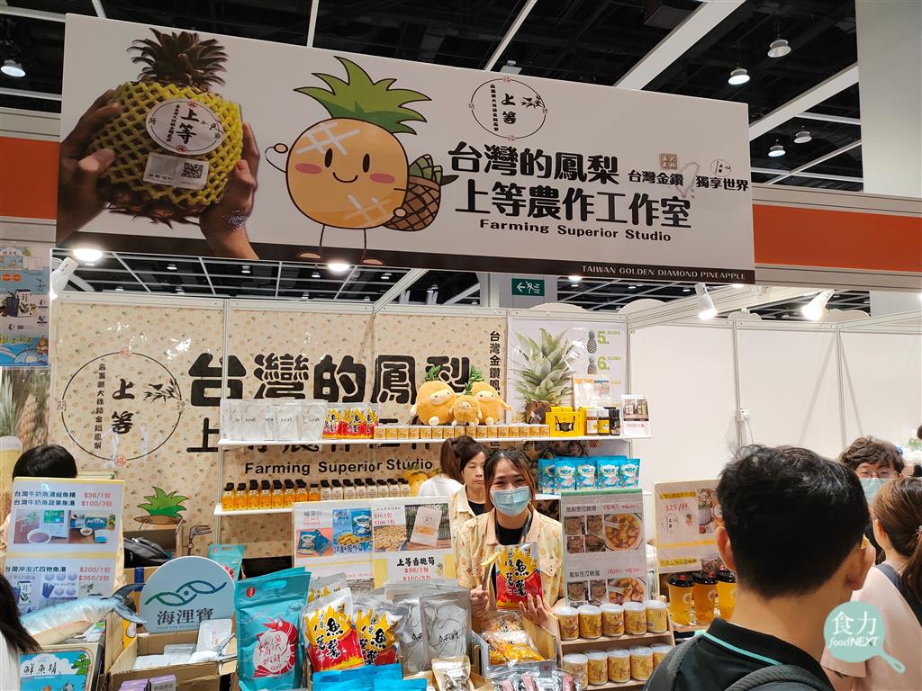 他們都是來自嘉義的品牌,一家是樺憲國際有限公司的「海浬寶」,另一家是三代種植鳳梨的「上等農場」。兩家的商品都很獨特,因此被香港的婆婆媽媽們圍住問個不停。海浬寶展出蔬果魚湯、鮮魚精,在台灣,蔬果魚湯只要一推出幾乎都被團購媽媽們搶購一空,因此市面上幾乎不見其產品。