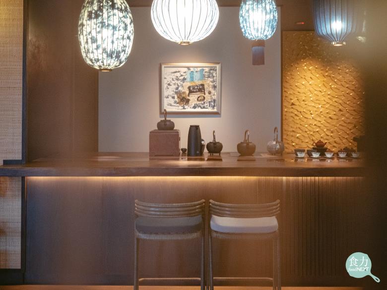 餐廳內的照明也是不容錯過的亮點,有來自以色列的燈具品牌Aqua Creations,及荷蘭品牌Taiwan-Lantern結合高雄美濃藍染製作而成的燈籠,甚至在通往洗手間的路上,還能看見香港家居裝飾品牌Lala Curio的手工刺繡,牆面上活潑的猴拿著茶壺,取意來自屬猴且愛茶成痴的寶元紀創辦人蔡其建。空間中流淌的音樂時而能聽見東西方不同風格的曲調,任誰都能在這裡找到自己的「家鄉味」,相互和諧搭配、各有風采。