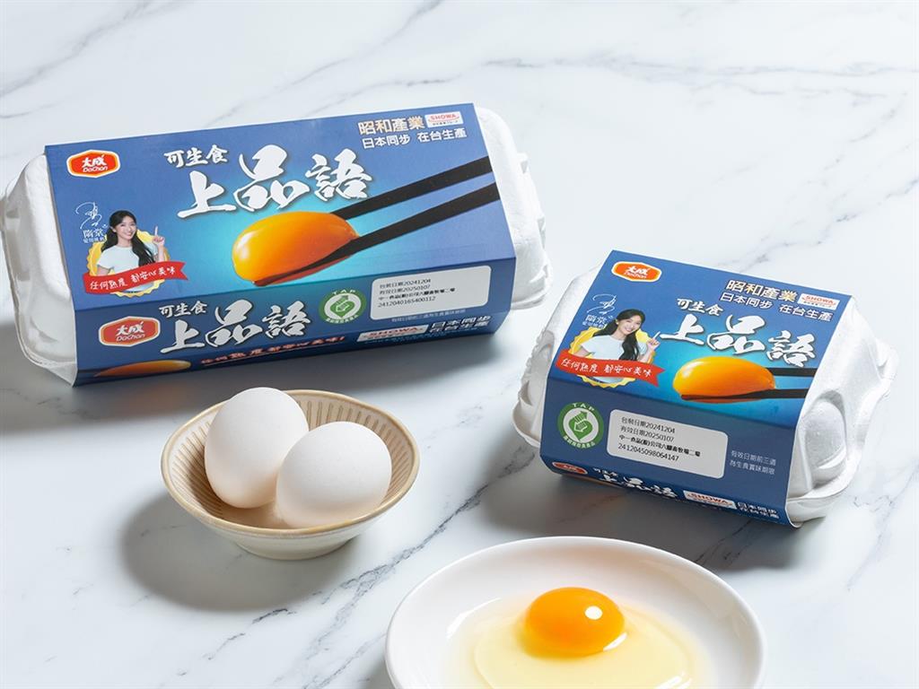 大成集團2023年10月推出全台第一顆可生食雞蛋後,迄今已有全台連鎖餐飲集團、米其林餐廳等超過40家餐飲品牌所選用;為了提供消費者安心無虞的雞蛋,大成集團藉由垂直整合、水平分工策略,匯集產業知識與技術,成為全台唯一串連上、中、下游的蛋品產業,更於2024年12月10日發布日本生食等級「上品語鮮蛋」全台通路上市販售。