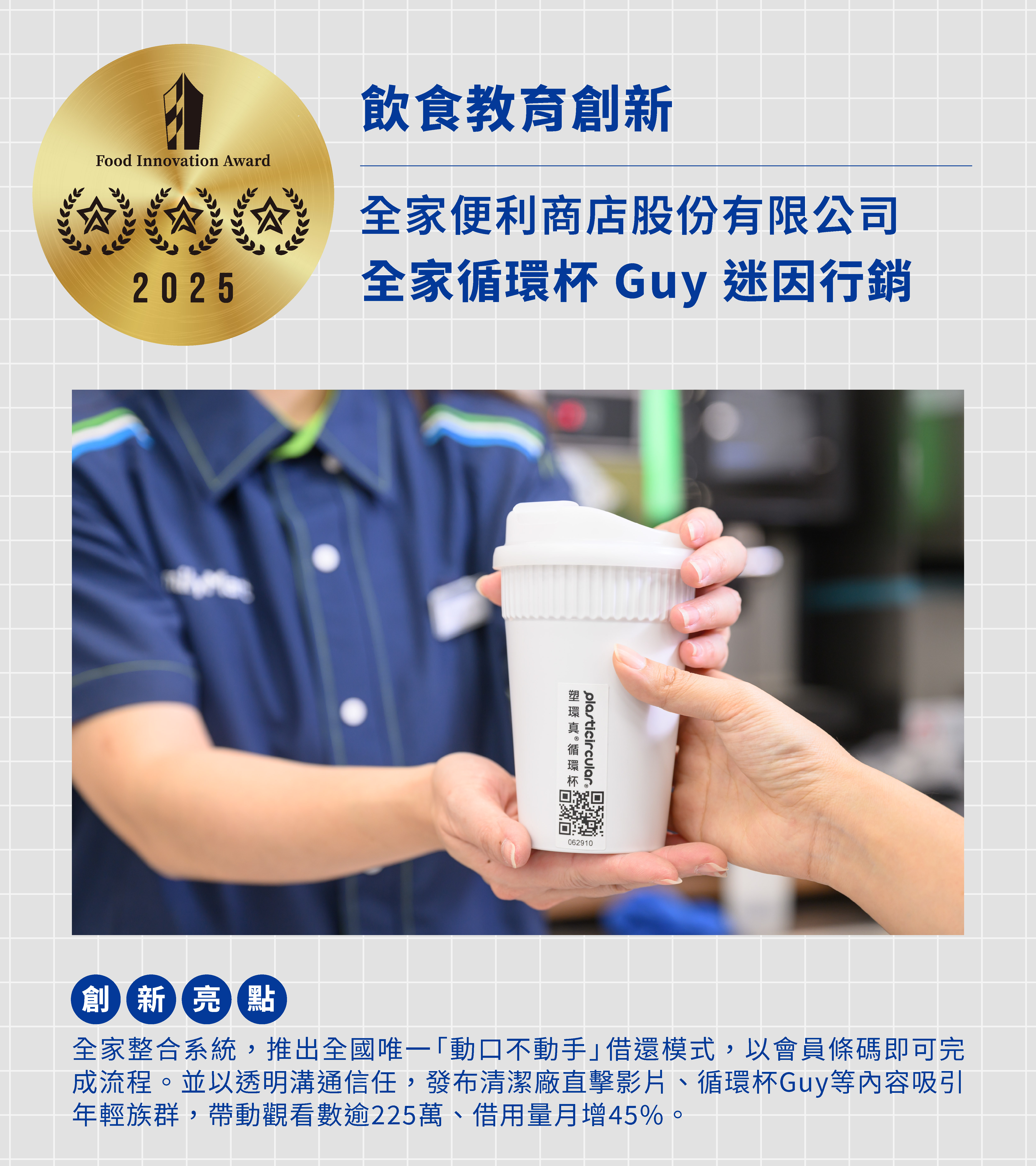 全家耗時一年完成系統串接與流程整合,推出全國唯一「動口不動手」借還制度,只需會員條碼或手機號碼即可完成借還,無需操作機台或押金,大幅降低使用門檻。在社群教育方面,透過清潔廠直擊影片與「循環杯 Guy」幽默短影音,向消費者展示透明清潔流程,提升信任與使用意願,進一步提升循環杯借用量。