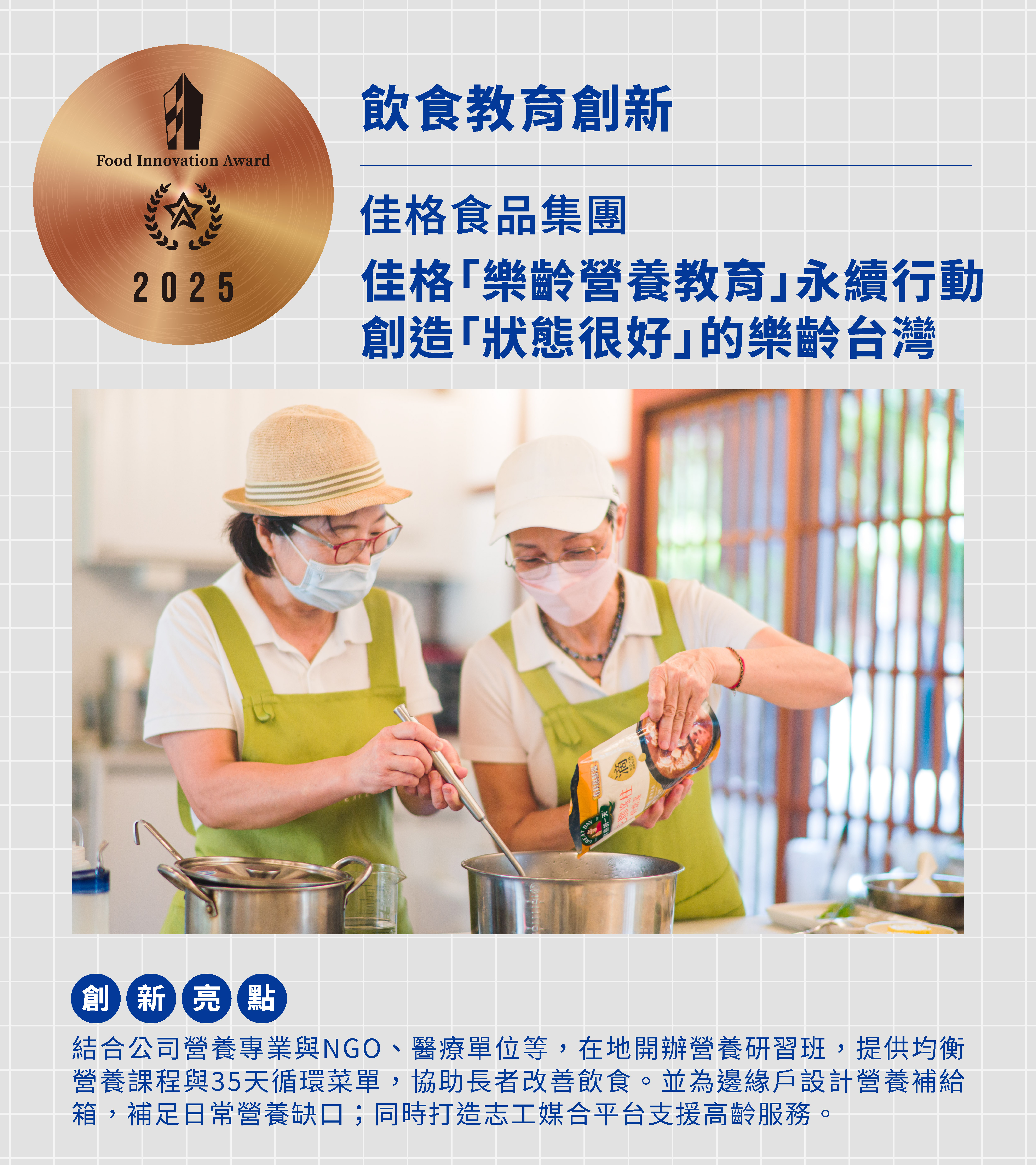 台灣已邁入超高齡社會,長者健康不良平均餘命占10%,勞動力短缺與僅 9.9%的低勞動參與率問題嚴峻,邊緣戶長者更面臨營養不足與健康風險。社會參與與就業有助於維持高齡者身心健康,減緩失智與社交孤立。有鑒於此,佳格推動「『樂齡營養教育』永續行動,創造『狀態很好』的樂齡台灣」獲得一星肯定。