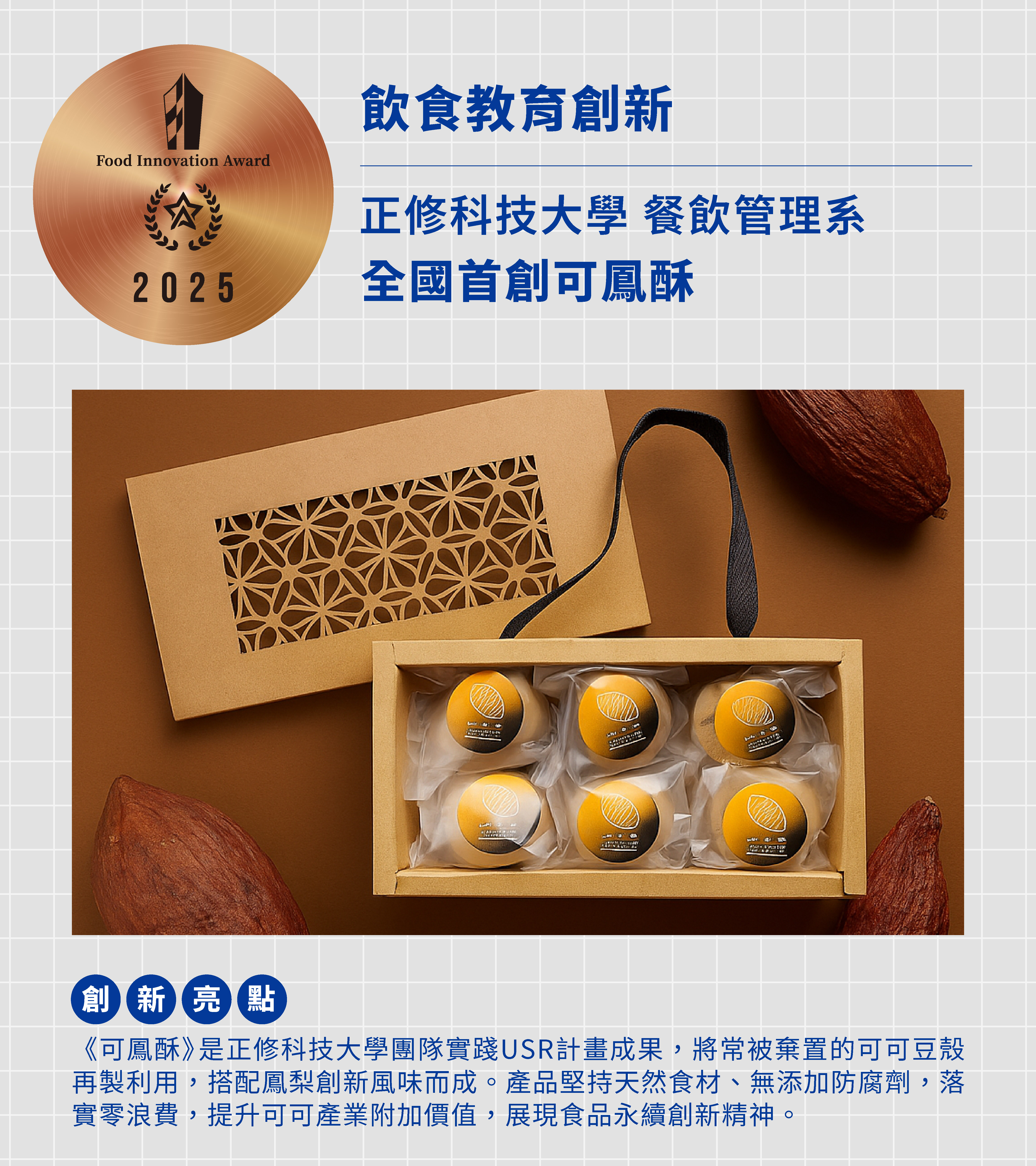 正修科技大學餐飲管理系「全國首創可鳳酥」是本屆唯一得奬的大專院校。正修科大團隊以大學社會責任(USR)為核心理念,積極鏈結在地資源、促進區域創生,此次新品由正修科大攜手屏東泗林衛生室與薇庭烘焙品牌共同開發,實踐產官學三方合作,開創食品永續的新契機。《可鳳酥》以可可和鳳梨為核心,並將SDGs理念落實於產品開發中。團隊將過往常被棄置的可可豆殼再製利用,協助地方創生,以實際行動影響在地社區與產業,展現大學在USR實踐中兼顧教育、社會與環境效益的典範。