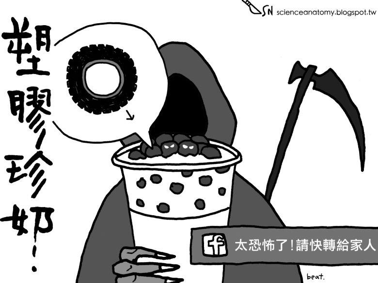 2015年10月20日,「自由時報電子報」刊登了這則新聞:〈扯!中國飲料店員自爆:珍珠由舊輪胎、鞋底製成〉,真是把許多人嚇呆了,珍珠能夠用舊輪胎或鞋底製成嗎?後來證實這則新聞是一篇來自於中國,但卻被斷章取義的報導,但震撼力實在太強了,使得解剖員望著手邊的珍珠奶茶,不敢貿然一飲而盡,心想還是先搜查相關的報導確認一下好了。