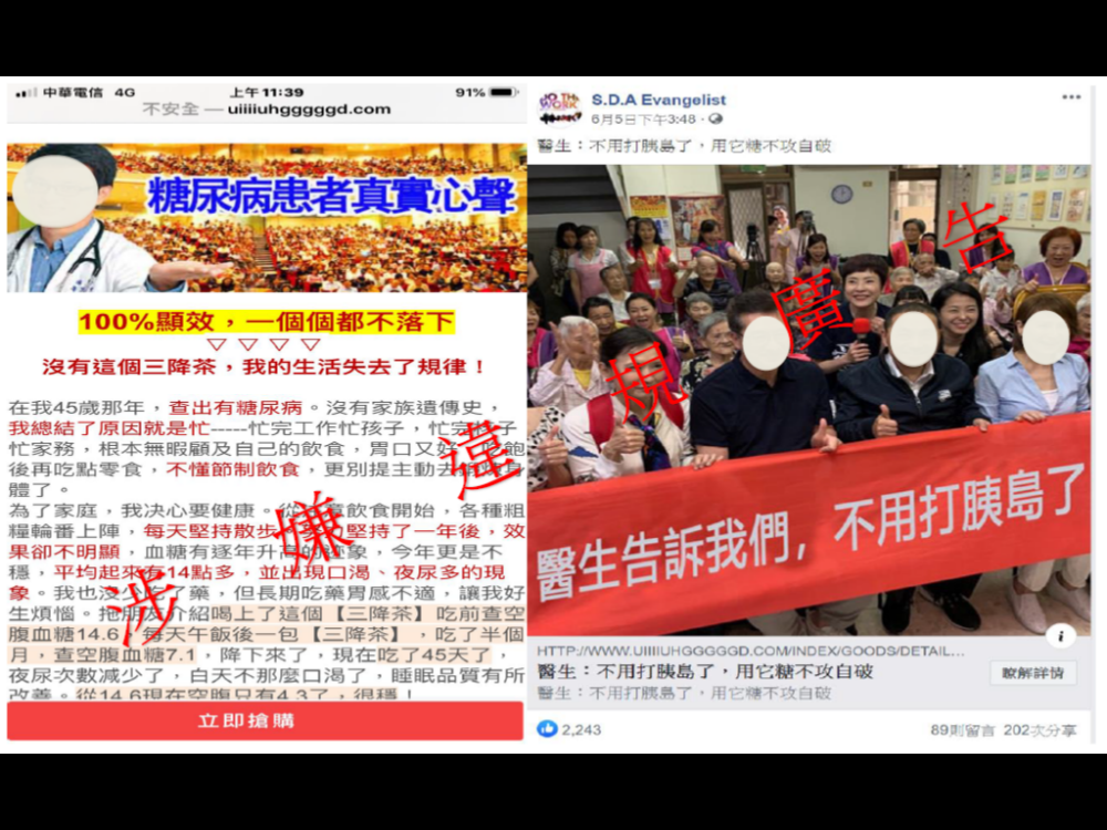 近期網路平台出現數個「一頁式廣告」,販售號稱可以治療糖尿病的「三降茶」,並盜用知名小兒科醫師黃瑽寧的照片,無視糖尿病患者安全,以故事行銷詐欺受騙上當的患者,提醒讀者必須張大眼睛小心此類毫無根據的誇大醫藥/食品廣告。
