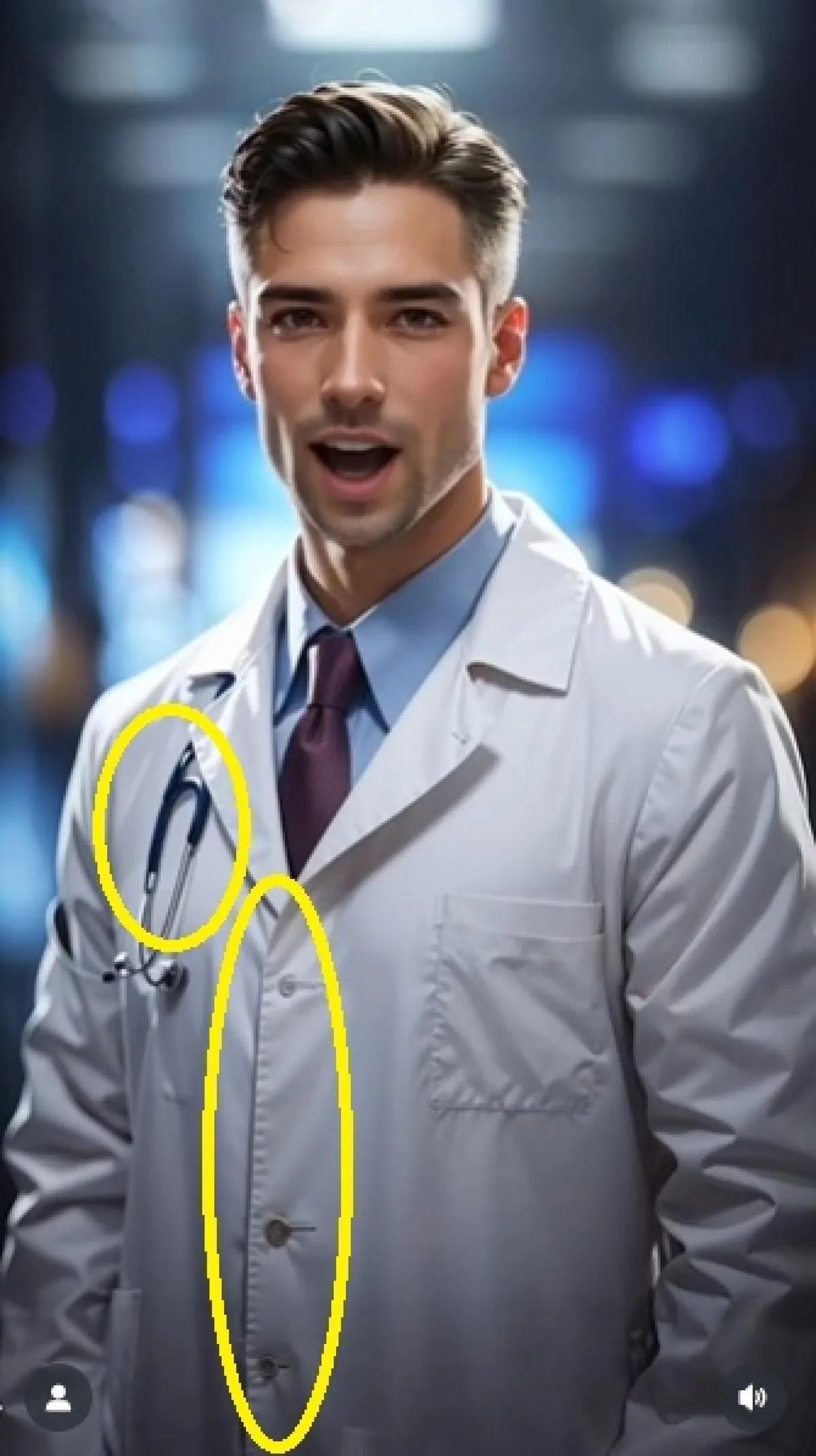 再看一個Instagram上的海外案例,這部短影音2023年推出時便獲得超過8萬次觀看,不過可以從鈕扣、聽診器等部分發覺問題。鈕扣間距有著顯著的差異,甚至顏色、造型都不一致,而聽診器造型也存在破綻。