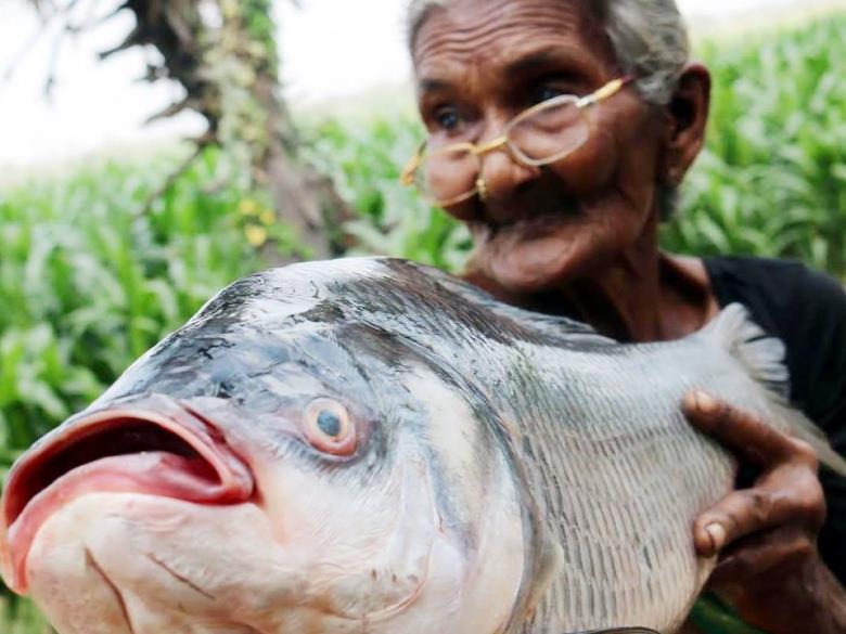 馬斯塔娜嬤捧著一條魚,即便是一整條魚也難不倒她。(圖片來源=Cook with Mastanamma)