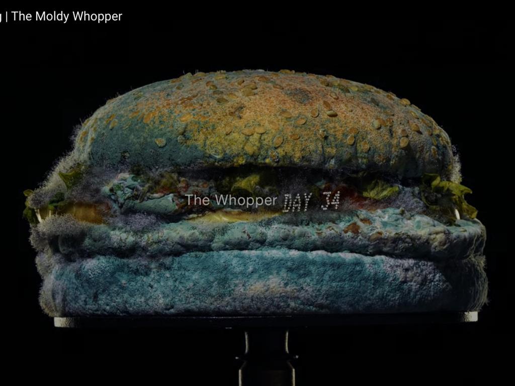 全球連鎖速食品牌漢堡王推出了一支長達 45秒的縮時廣告影片,呈現漢堡王的招牌餐點華堡(Whopper)從新鮮出爐到放置了34天後的模樣,展現出「沒有人工防腐劑之美」,強調產品沒有人工防腐劑和人工香料。