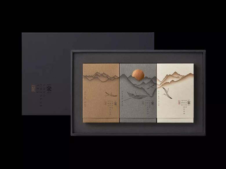 宋-山茶由人工木炭焙製而成,三種不同色彩的紙以區分每款茶葉的濃度,利用火焰灼燒的燒焦感勾畫山的輪廓,再反覆折疊成三層營造出山巒層疊的樣式,很好的體現了水墨畫的質感和烘焙茶的品種。