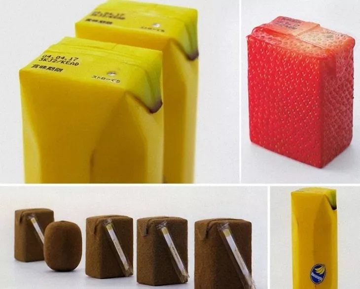 不過,可別以為日式極簡風就是「性冷淡風」,工業設計大師深澤直人的經典概念作品——Juice Skin雖然在視覺上具有衝擊力,但依然貫徹了日本人的減法之道:返璞歸真,使用與果皮相似的材質,將水果本體與包裝聯繫起來,讓用戶感知到飲料的原味。