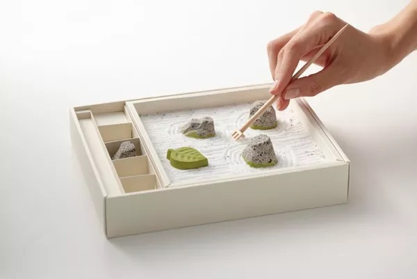 這種日式簡約風在日本食品包裝的設計上十分突出,比如將日式枯山水庭院與和果子完美結合的「心安寺石庭」還有Muji白色系的食品包裝袋。