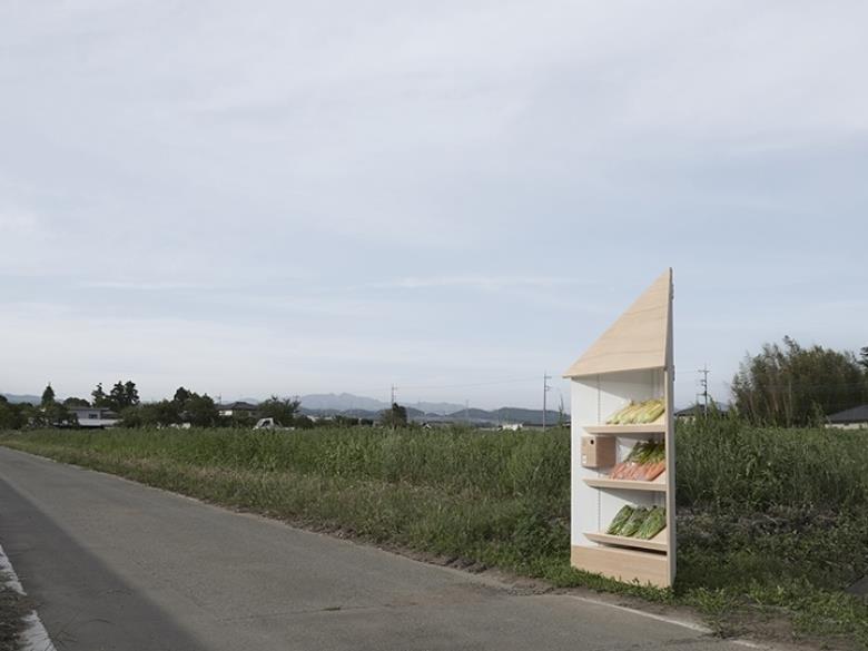 nendo所設計之「petit market」無人蔬果攤,藉由農民直接到消費者的銷售,振興當地經濟,同時亦能減少食物浪費。(圖片來源:Shopping Design提供)