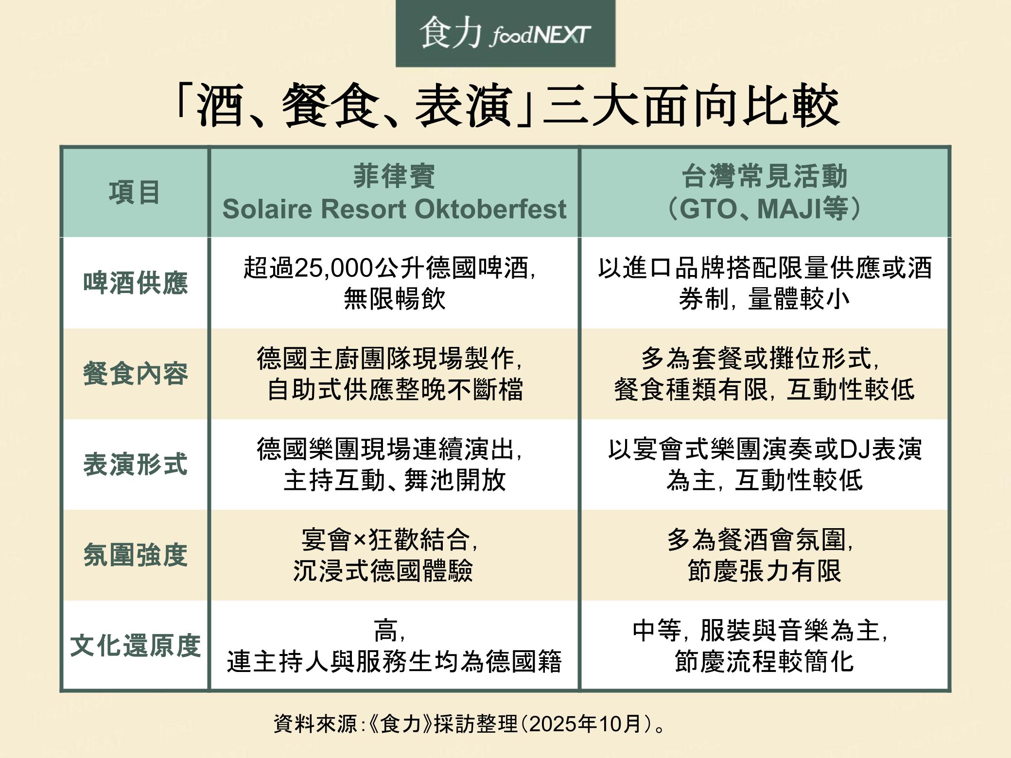 總體而言,台灣各地所舉辦的幕尼黑啤酒節(Oktoberfest),仍偏向企業社交、品牌推廣或主題餐飲性質,活動設計更講究秩序與品味,而空間規模也有其限制;而Solaire Resort的版本則更接近「狂歡節式文化再現」,以沉浸體驗與高互動度取勝。