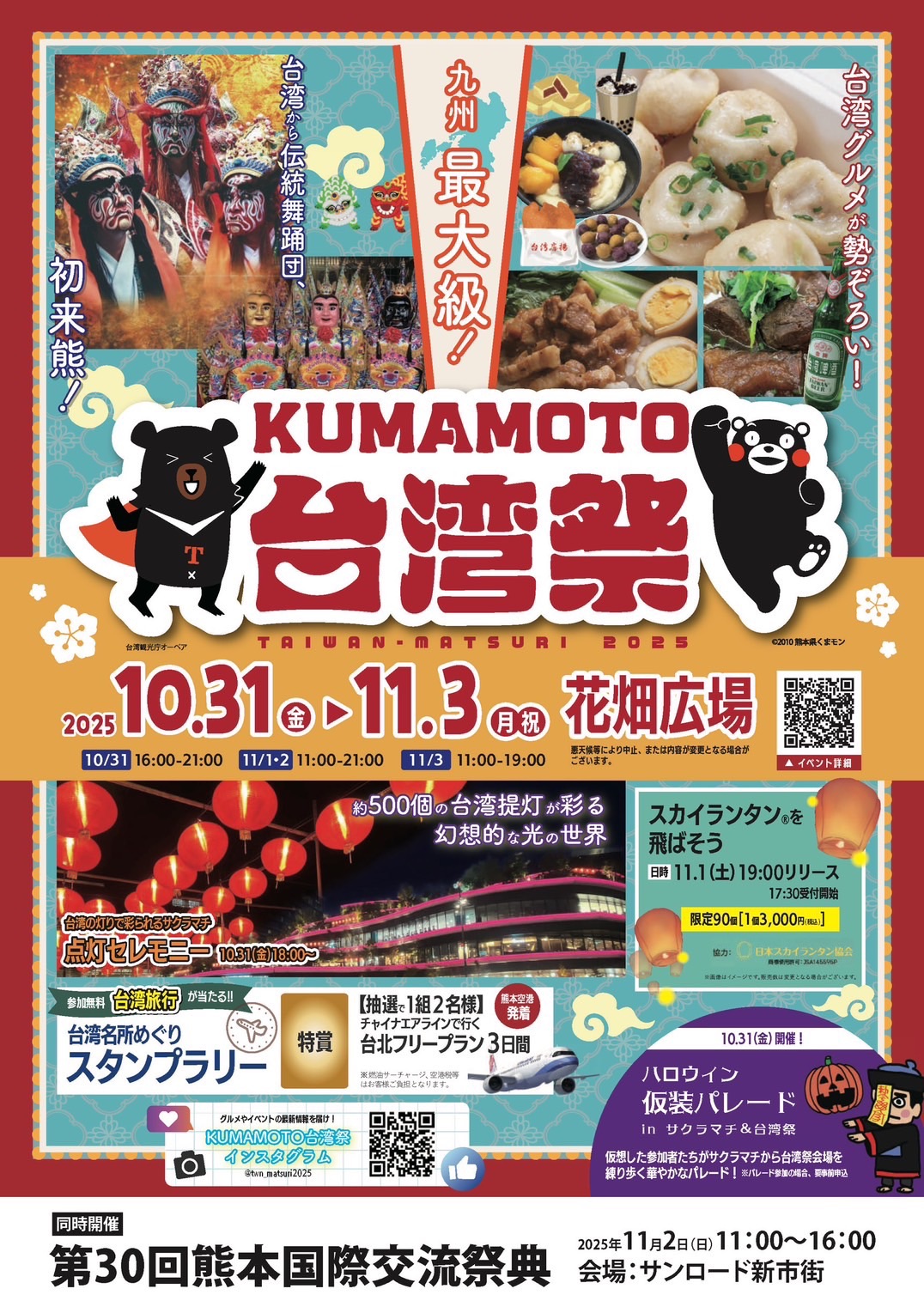 「KUMAMOTO台灣祭2025」將於2025年10月31日至2025年11月3日在熊本SAKURA MACHI花畑廣場舉行,預計吸引逾13萬人。活動重現台灣夜市風情,50多個攤位提供道地美食、雜貨與伴手禮,並有舞團表演、燈籠夜景、拜拜體驗及趣味抽獎,深化台日文化與觀光交流。