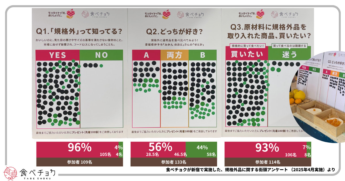 2025年4月,食べチョク在JR新宿站前舉辦「都市型直銷市集」,邀請民眾試吃正規品與格外品柑橘(品種為「せとか」)。結果顯示,有56%受訪者更喜歡或認為「兩者都好吃」,且高達93%表示願意購買使用規格外原料的商品。