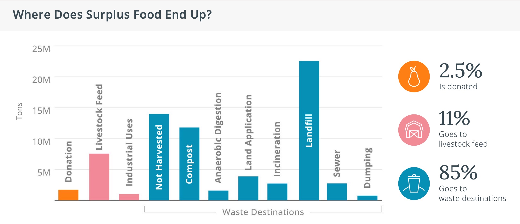 ReFED統計顯示,美國剩餘食物多數未被有效利用,其中約85%最終流向掩埋、焚化等廢棄處理體系;相較之下,僅有2.5%被捐贈、11%用於飼料,顯示資源再利用比例仍明顯偏低。(圖片來源:取自2026 ReFED U.S. Food Waste Report)