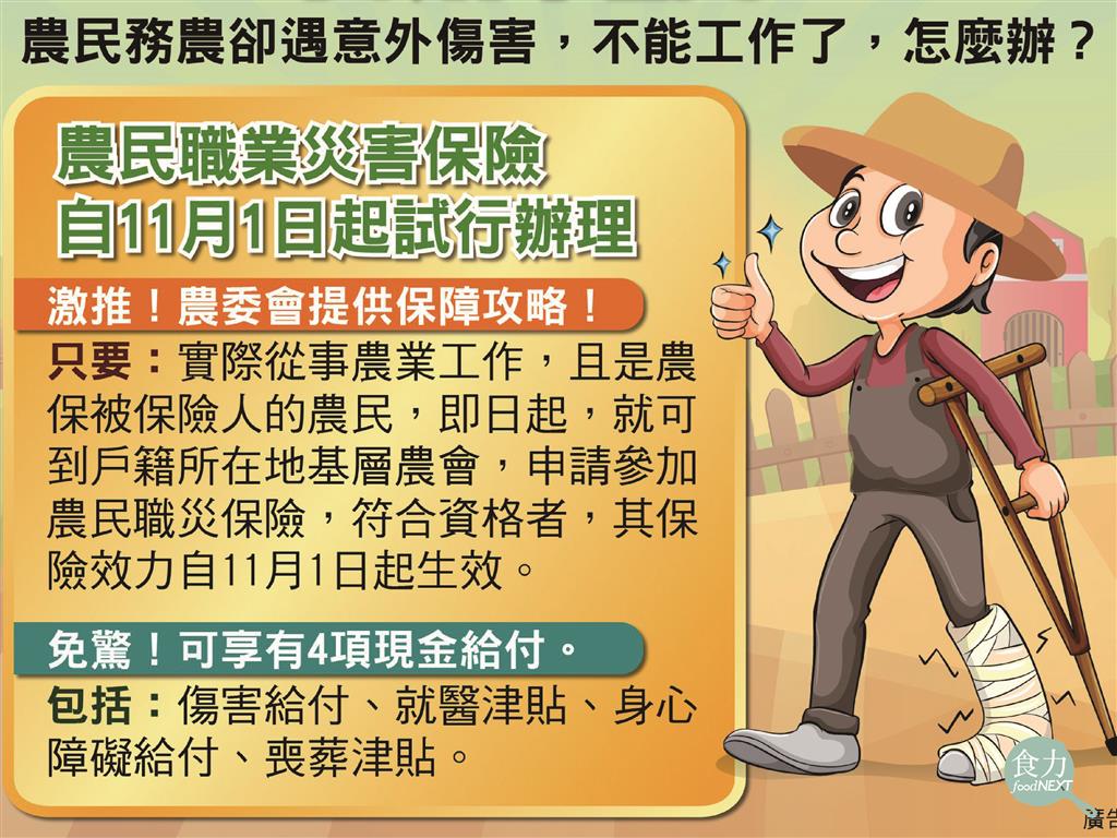 2018年11月1日農民職業災害保險正式上路,即日起具農民健康保險資格之實任耕作者均可自願加保。農委會表示,此政策讓農民所得有保障,未來也會推出更多保障及管理辦法,提升台灣農業價值。