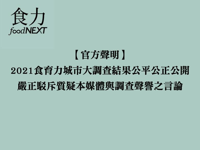 對於「2021食育力城市大調查」評比結果,《食力》尊重各方言論發表,惟少數團體或個人以主觀推論蓄意攻擊本媒體與評比之公信,為避免大眾因此有錯誤理解與揣測,特此嚴正澄清,也盼各界在發表意見前能謹守實事求是的原則,若有汙衊本媒體聲譽之情事並損及本媒體權益,將訴諸司法以維公信,也敬請第三人切勿散播相關說法,如不當損及本媒體之聲譽,本媒體都將依法主張,以維權益。