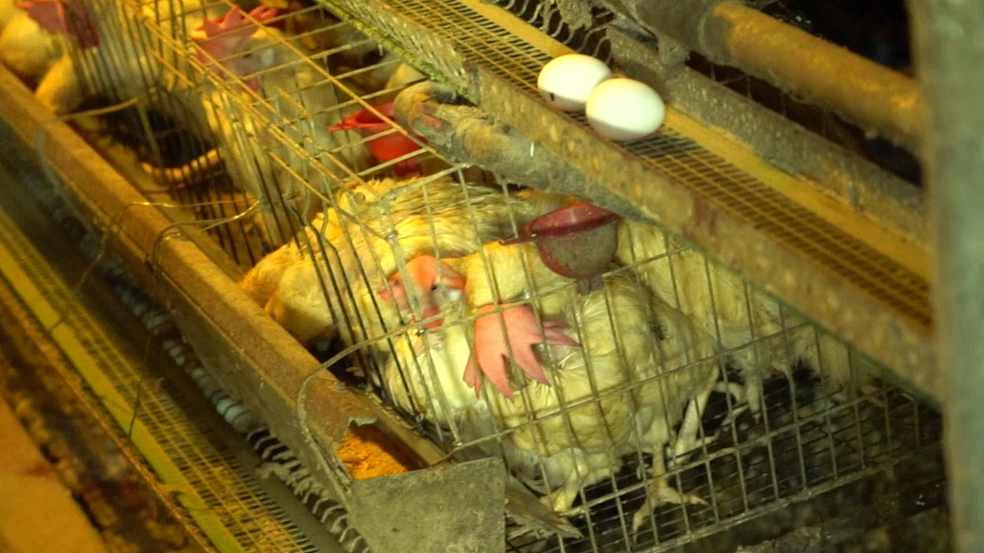 百勝餐飲集團在台南的主要雞蛋供應商,將蛋雞飼養於不符合動物福利的巴格達籠中。(圖片來源:Equitas提供)