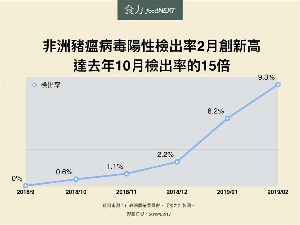 目前驗出的25件案例自2018年10月發現第一例開始起算,從中可發現檢驗出陽性的頻率和檢出比例都越來越高。2018年10月~12月,三個月間檢出7件,但2019年1月至2月17日,僅1個半月,就已經累積達到18例。此外,檢出陽性的比例也從2018年9月0%、10月0.6%、11月1.1%、12月2.2%。到了2019年1月6.2%、2月9.3%,已是2018年10月疫情剛發生時的15倍之多,且目前檢出率仍處於持續上升的趨勢。