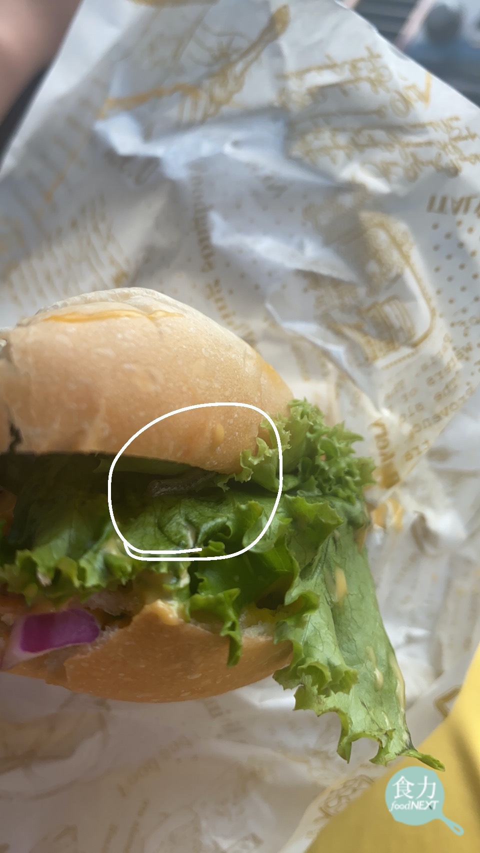 不止一個消費者在食用漢堡時發現有菜蟲,在扭登和台北松山店的Google評論裡,也有網友表示,在吃漢堡時發現一隻很大的蟲出現,扭登和餐點的衛生疑慮多次被網友提出質疑。(圖片來源:扭登和前員工提供)