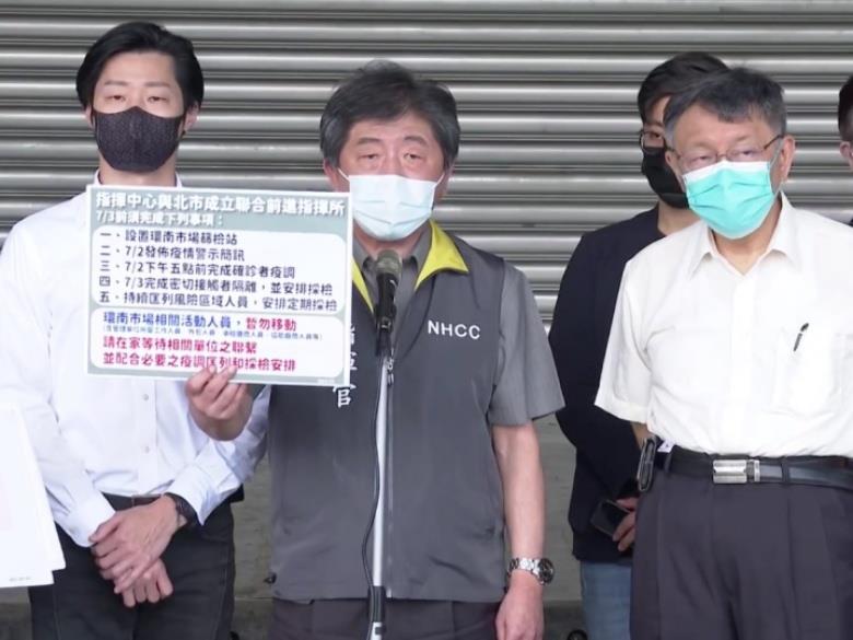 陳時中宣布中央疫情指揮中心與台北市政府設立聯合前進指揮所,並宣達5點事項: