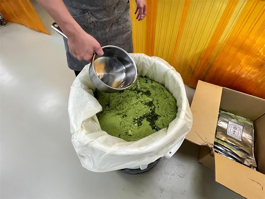 經台北市衛生局人員稽查,於帕米貝可蝴蝶酥內湖區的製作場所原地銷毀8包過期抹茶粉,並查扣1包作為衛生局留存。(圖片來源:台北市政府衛生局提供)