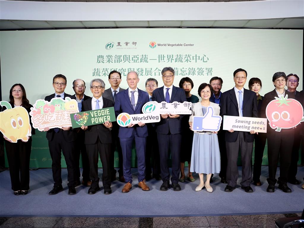 農業部2024年7月31日與亞蔬—世界蔬菜中心(簡稱世界蔬菜中心)簽署蔬菜研究與發展合作備忘錄,農業部陳駿季部長、世界蔬菜中心沃培睿(Marco Wopereis)主任及10個試驗改良場所皆出席簽署,在雙方締結合作備忘錄下,未來將立基於過去50年的合作基礎,共同攜手接軌國際創新科研發展,並致力建立各區域氣候韌性及環境負責的蔬菜產業,以保障全球消費者的健康及營養。