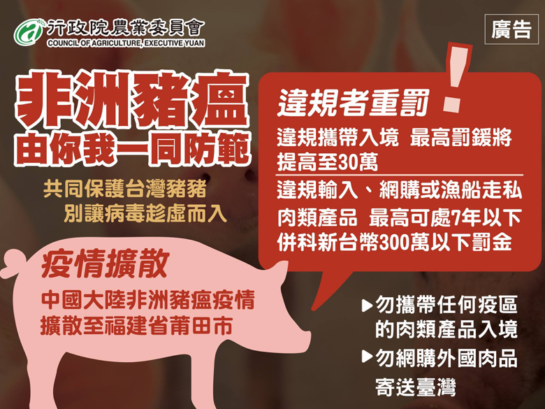 防檢局強調,自2018年9月1日起針對旅客違規攜帶中國豬肉產品者,雖已依法裁罰最高額罰鍰新臺幣1萬5千元,仍難達真正嚇阻的效果,故防檢局已著手修法提高罰款額度最高至30萬元,修正草案業由行政院於2018年11月12日函送立法院審議,未來修法通過後違規旅客將被處罰比現在更高額度的罰款。防檢局最後呼籲,旅客切勿自中國大陸等非洲豬瘟疫區國家攜帶肉品入境,否則將被重罰,以防範疫病入侵,共同維護我國農畜產業生產安全。