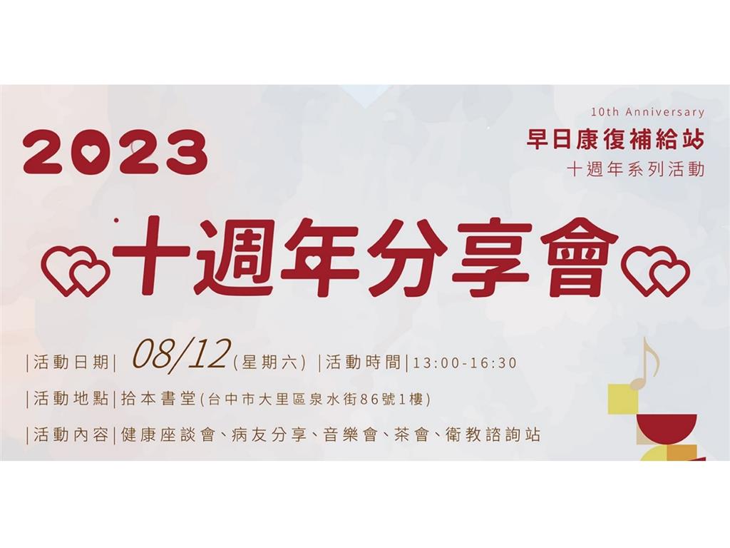 「早日康復補給站」是康善基金會專為癌症病友服務的計畫,10周年分享會於2023年8月12日(星期六)下午1點在台中大里軟體園區圖書館「拾本書堂」舉行,邀請到臺中榮總家醫科朱為民主任來談病友與家屬間的對話,現場一併設置臺中榮總與童綜合醫療團隊的攤位提供民眾健康諮詢,午茶時間也準備當地小吃及音樂,報名前100名的病友更能獲得價值4000元的健康禮包。
