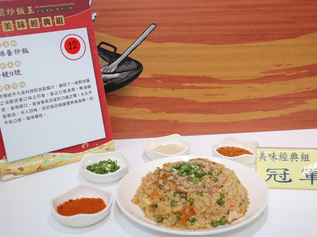 其中美味經典組冠軍台北市欣丼食堂的肉絲蛋炒飯,以高溫拌炒出油亮光澤的台稉9號米,加上肉絲、蔥花提香,完美呈現米飯香Q彈牙口感,簡單卻令人回味。創意潮流組冠軍台中市御臻園麵食館的包炒飯,以九層塔包子皮包覆以台南11號米製成的三杯雞炒飯,鎖住米香和湯汁精華,創意十足,分別獲頒新台幣10萬元獎金。
