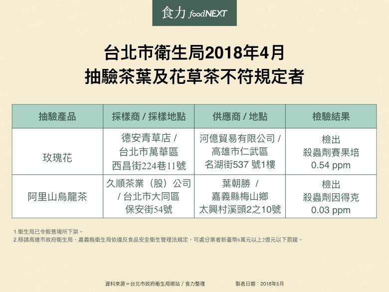 台北市政府衛生局2018年4月前往超市、賣場、茶行、飲料店等處抽驗茶葉及花草茶檢驗殘留農藥,共抽驗80件產品(包含70件茶葉及10件花草茶),檢驗結果2件產品不符規定,不合格率2.5%。