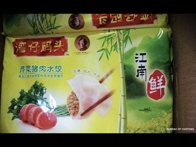 菲律賓海關局2019年12月於馬尼拉查獲一批進口的中國製「灣仔碼頭」冷凍水餃,檢驗後發現遭到非洲豬瘟病毒感染。(圖片來源:CNN Philippines)