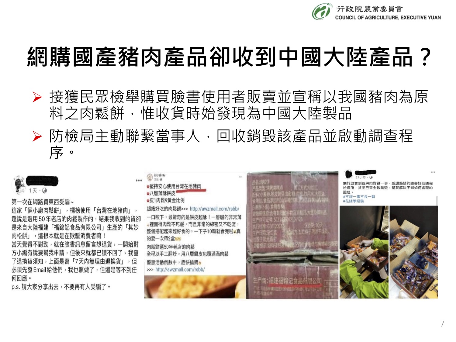 陳吉仲表示近日有民眾反映於臉書廣告購買標榜我國產製肉鬆餅,卻收到中國製肉鬆餅案例。(圖片來源:防檢局提供)