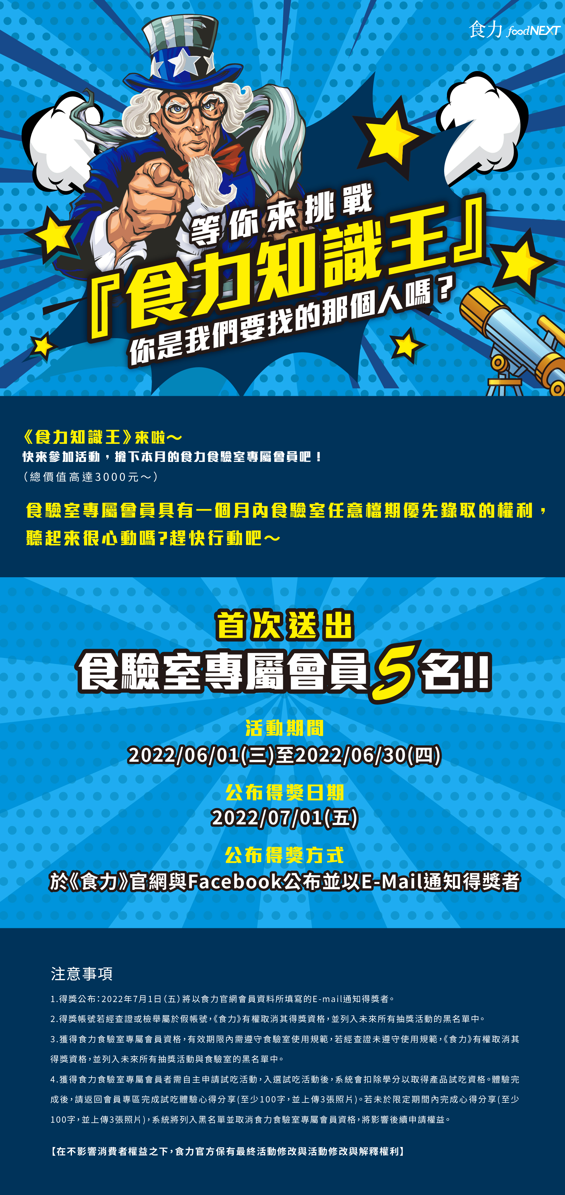 你熱愛閱讀嗎?你關心每天你吃下去的東西嗎?所有跟飲食相關的小知識都在食力,你通通能答得出來嗎?現在只要加入食力官網會員,並在2022年6月30日(四)23:59前全力累積食力學分,就有機會成為食力知識王,並且獲得食力食驗室高級會員(一個月內有效),隔月用學分申請食驗室試吃體驗通通保證入選,這樣的好康,你還不爭取嗎?