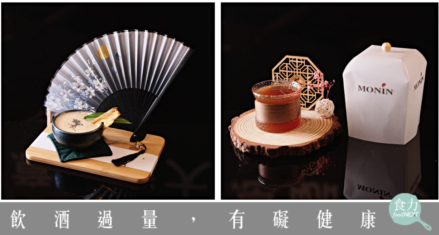 咖啡雞尾酒「秋暝」則是結合中式茶藝概念,將璞珞精選耶加雪啡精品咖啡豆的手沖咖啡與自製茉莉綠茶琴酒混合,搭配玫瑰、烤栗子風味糖漿,以簡單的基底凸顯出MONIN糖漿香氣,並且別出心裁製作天燈擺飾灌注肖楠木煙燻氣味,非常貼合本次大賽主題,一次滿足味、視、嗅、聽、觸覺的五感體驗。