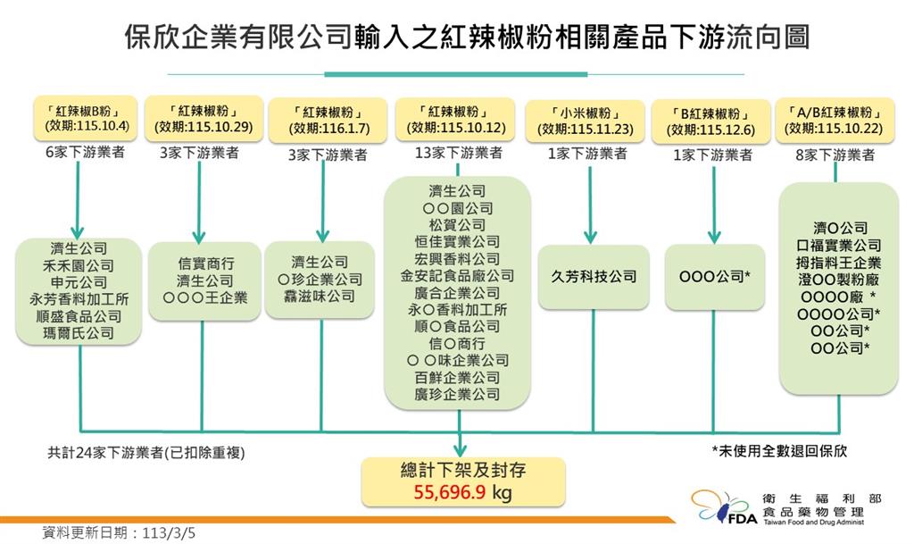 食藥署持續追蹤地方政府衛生局辦理問題產品下架事宜,截至2024年3月5日,共計下架及封存辣椒粉及其產品122,588.4公斤。