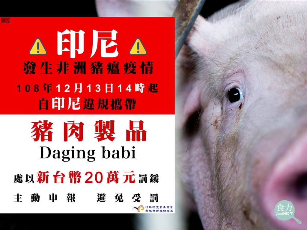 根據聯合國糧食及農業組織周報指出,印尼農業部於12月12日宣布該國發生非洲豬瘟疫情,印尼是亞洲地區繼中國大陸、蒙古、越南、柬埔寨、北韓、寮國、緬甸、菲律賓、韓國及東帝汶後第11個發生非洲豬瘟疫情的國家!於2019年12月13日下午2時起,自印尼攜帶豬肉產品入境遭查獲即予重罰!