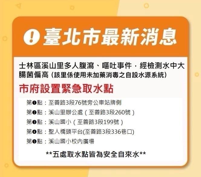 ▶士林溪山里多人上吐下瀉、水源大腸桿菌偏高!蔣萬安:新增4個緊急取水點 、聯醫開設特別門診