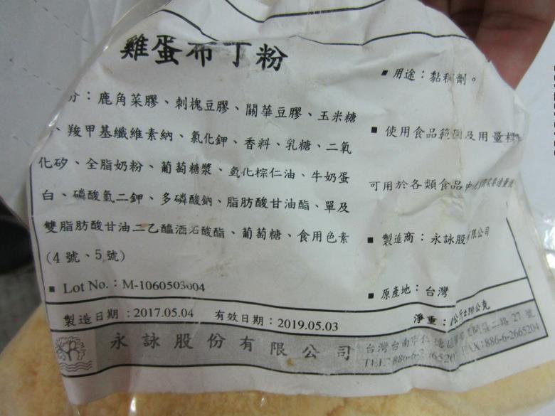 逾期原料再製食品事件又一遭!食藥署及臺南市衛生局、臺南市調處於2018年6月19日查獲香料添加物業者「永詠股份有限公司」使用逾期近2年的「丙二醇」生產草莓香精,並使用過期3年的食用黃色四號(有效日期:2015年6月7日)和過期4年的食用黃色五號(有效日期:2014年3月8日)色素生產「布丁粉」及「雞蛋布丁粉」等產品。