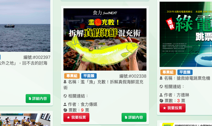 在人氣票選頁面「專業組—平面類」搜尋「濫「漁」充數!拆解真假海鮮混充術」,按下【我要投票】按鈕,為《食力》優質的入圍報導加油!