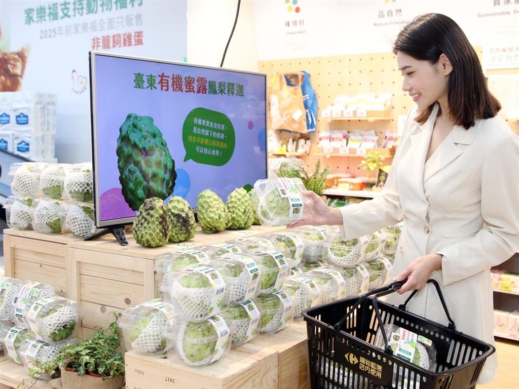 跨產業合作,推廣兼具生態保育的「臺東有機蜜露鳳梨釋迦」。(圖片來源:家樂福)
