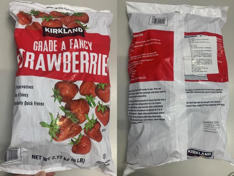 食藥署自2023年5月1日啟動後市場擴大抽驗計畫,截至5月16日止共抽驗74件產品,其中有1件科克蘭冷凍草莓遭檢出A型肝炎病毒陽性。(圖片來源:食藥署提供)