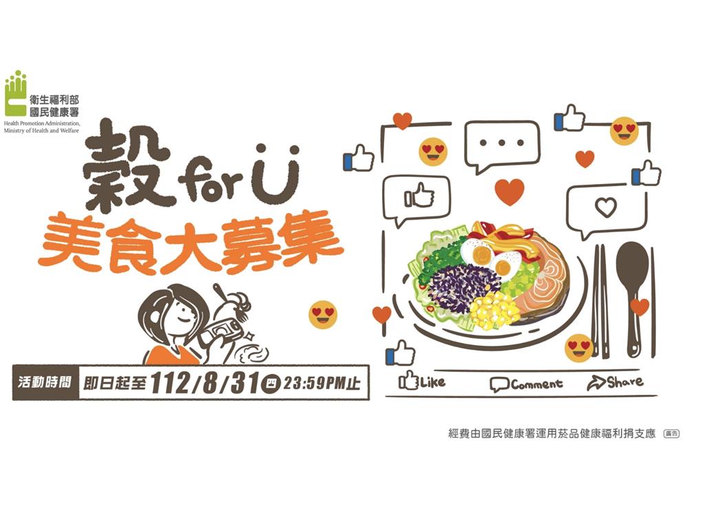 國民健康署於2023年10月5日至11月20日推出「穀for U食客吃起來」活動,串聯全台上萬間的店家,打造健康飲食生活圈,民眾只要到活動店家品嚐「榖糧」美味餐點,只要上傳照片至活動網址就有機會抽好禮!